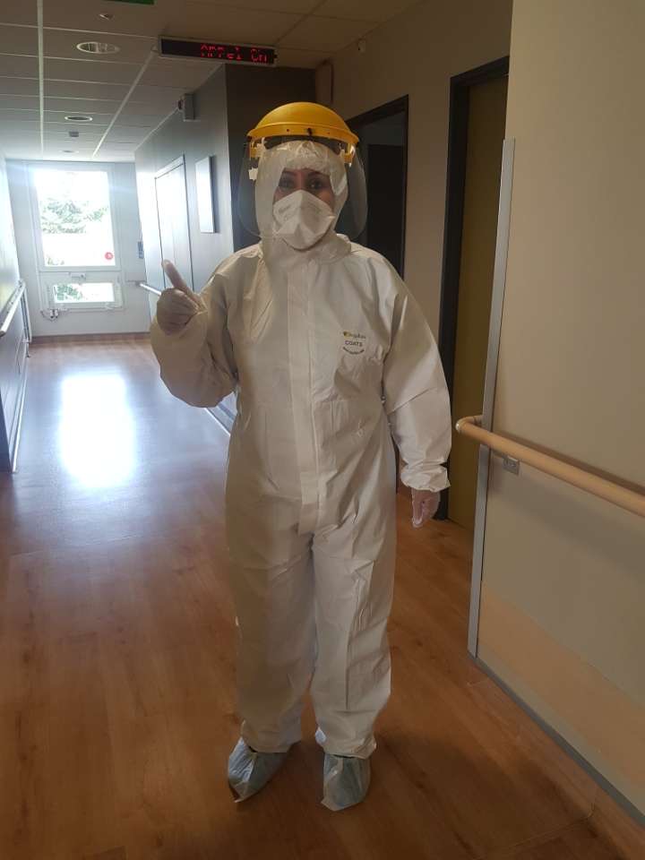 K : Notre tenue pendant cette crise sanitaire est composée de gants, masque, lunette de protection, charlotte, visière, la blouse du travail habituelle avec une combinaison à mettre par-dessus ainsi que des surchaussures. Des photos seront plus parlantes.