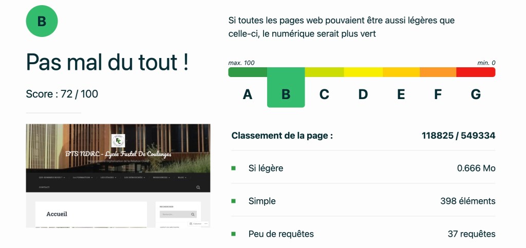 Enfin, la discussion sâest ouverte sur lâĂ©co-conception des sites web, lâaccessibilitĂ© numĂ©rique et lâusage raisonnĂ© de lâintelligence artificielle. Ămilie Hornech a notamment prĂ©sentĂ© EcoIndex, un outil permettant dâĂ©valuer lâimpact environnemental dâun site web. Ă cette occasion, un test a Ă©tĂ© rĂ©alisĂ© sur le site du BTS NDRC de Fustel, dont le rĂ©sultat sâest rĂ©vĂ©lĂ© tout Ă fait honorable, mettant en Ă©vidence un site relativement lĂ©ger et bien conçu.