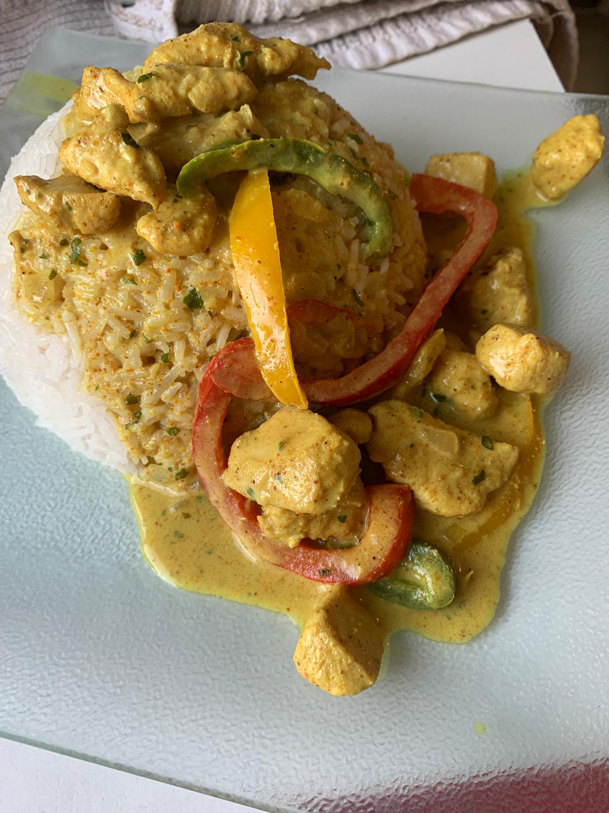 - Quand votre poulet est cuit ajoutez le lait de coco, deux cuillères à soupe de curry, une cuillère à soupe de gingembre, du persil ou de la coriandre, du sel, du poivre et le piment pour ceux qui veulent